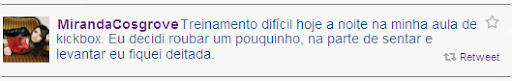 A pouco tempo atrás, uma das melhores amigas da nossa Miranda também uma de suas empresariais “Nina Munden” havia twittado que estaria fazendo aulas de Kickboxing com Miranda. E ontem ela mesmo confirmou, confira o tweet abaixo: